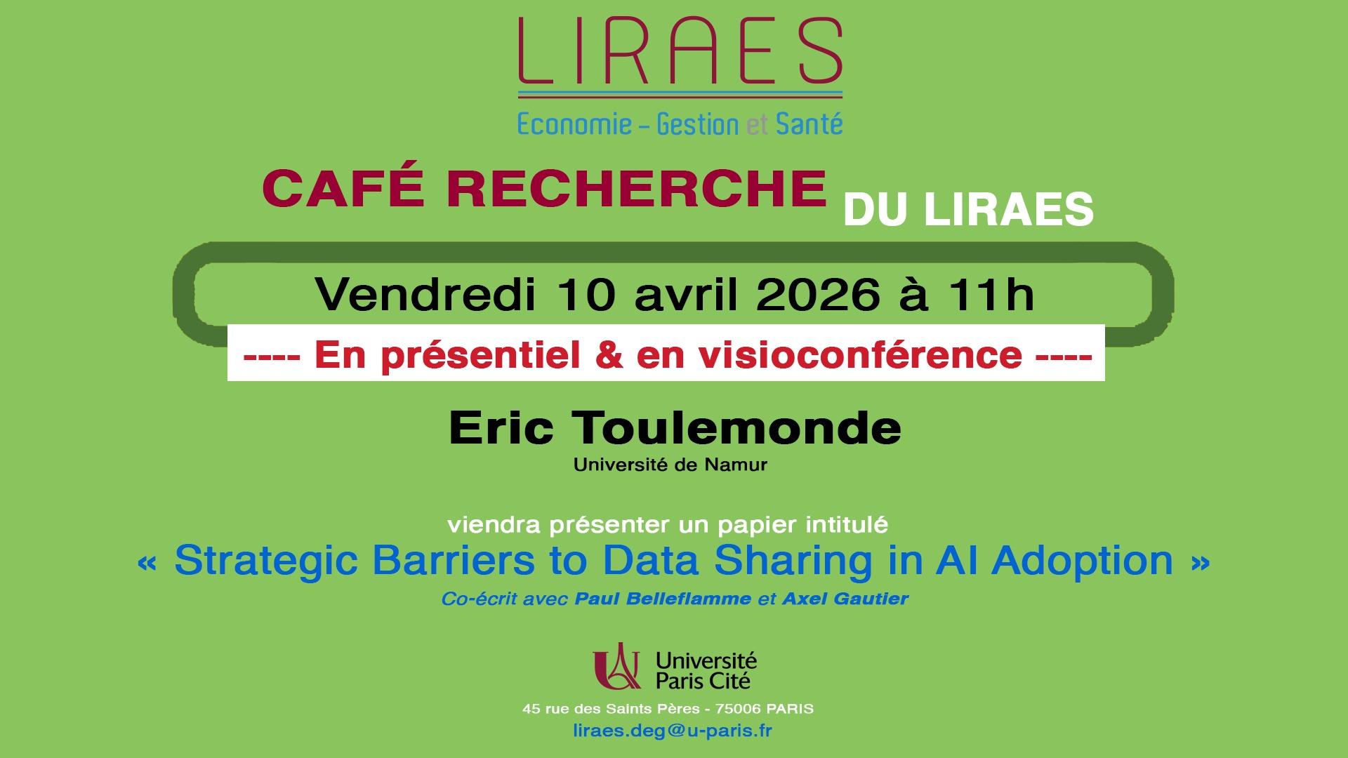 Dans le cadre des cafés recherche du LIRAES, organisés par Bertrand Chopard, Eric Toulemonde, Université de Namur, viendra présenter un papier intitulé “Strategic Barriers to Data Sharing in AI Adoption“, co-écrit avec Paul Belleflamme et Axel Gautier.